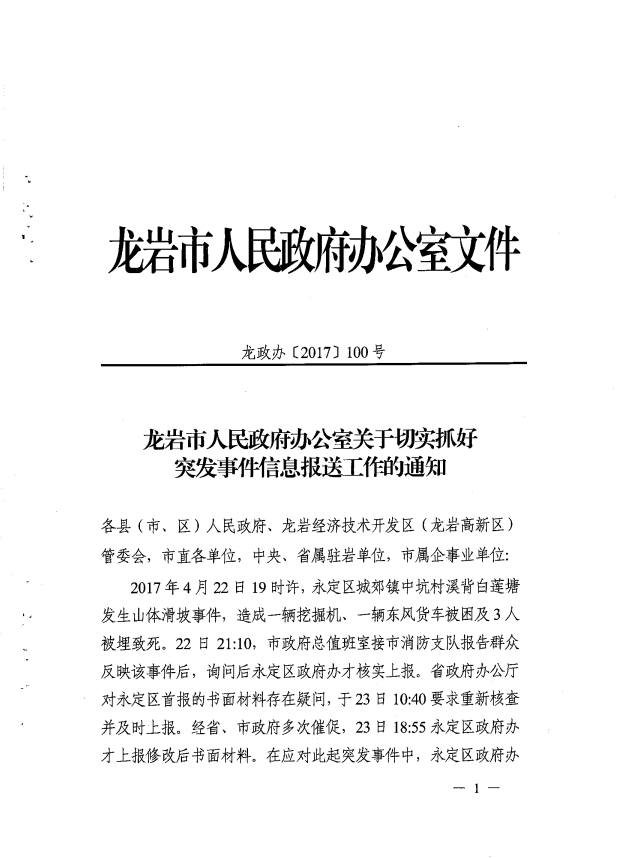 市政府辦關于切實抓好突發(fā)事件信息報送工作的通知(龍政辦【2017】100號)